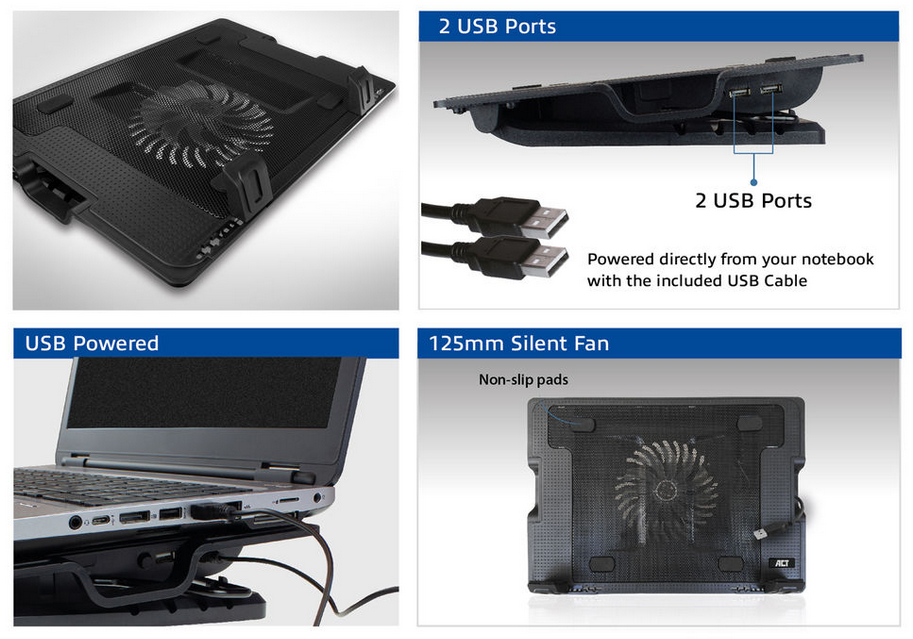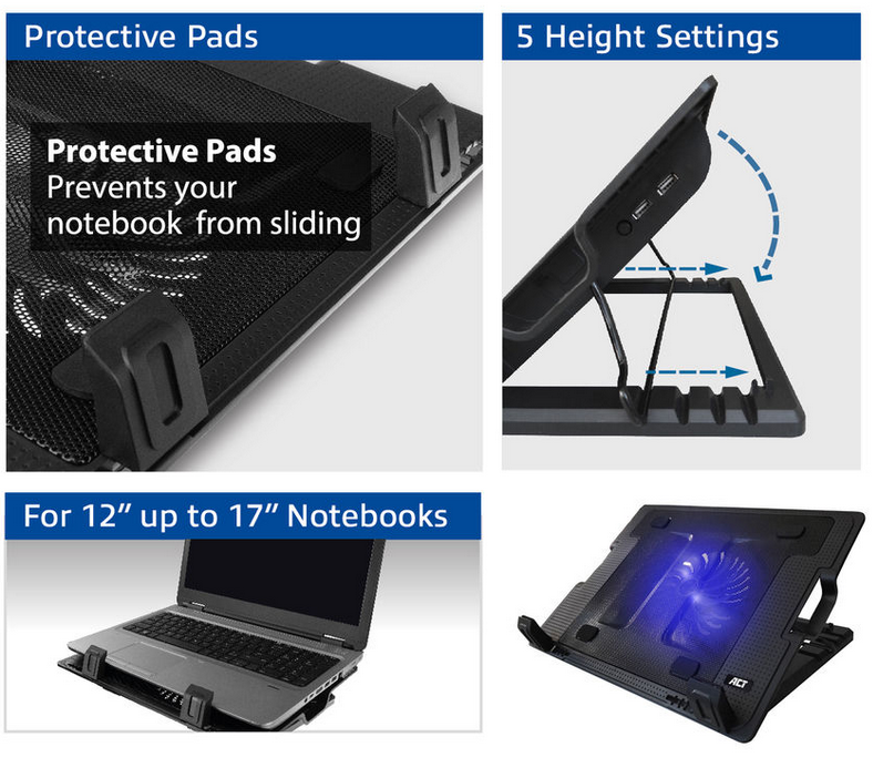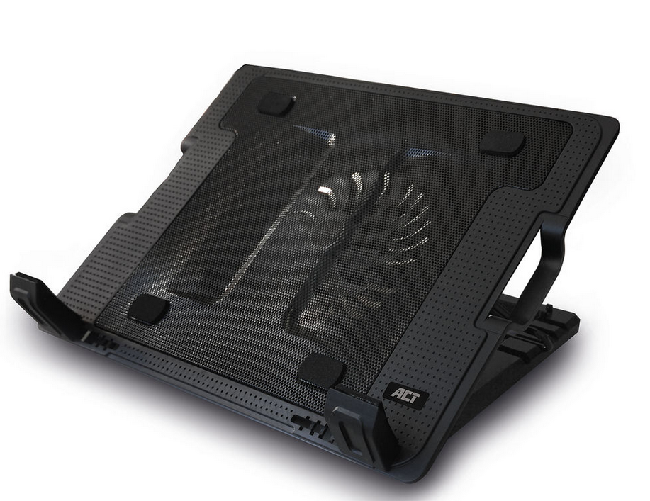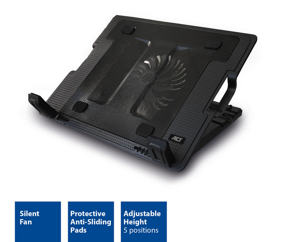 De ACT Laptopstandaard,met ventilator, hoogte verstelbaar in 5 standen, 2-poorts hub, heeft een metalen mesh bovenplaat en een krachtige maar stille ventilator en voorkomt oververhitting van de laptop. Deze veelzijdige stand is zowel te gebruiken als laptopstandaard en als laptopkoeling. Deze standaard wordt gevoed door USB. Hierdoor is geen externe voeding nodig. Dankzij de 5 verschillende instelbare kijkhoeken zit er altijd een juiste werkhoogte bij. Daarnaast voegt de laptopstandaard extra USB-poorten aan de laptop toe. De antislip rubberen voetjes zorgen ervoor dat de notebook stabiel blijft staan