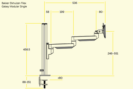 KLEM: Door een breed assortiment aan klemmen wordt het mogelijk de Filex Galaxy monitorarm te bevestigen aan de meeste bureaubladen.