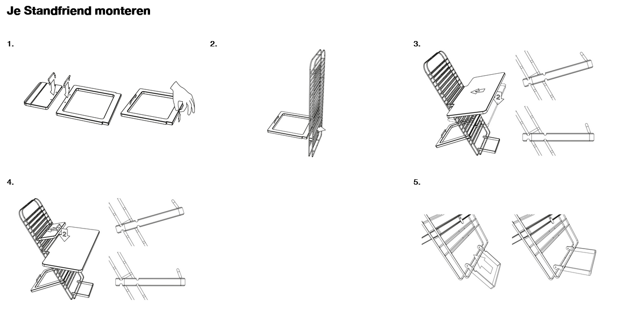Eenvoudig in gebruik - Standfriend is ontworpen voor gebruiksgemak. Je haalt je Standfriend in een paar stappen uit elkaar en kunt hem gewoon aan de muur hangen als je hem niet gebruikt. Ook dan ziet hij er prima uit.